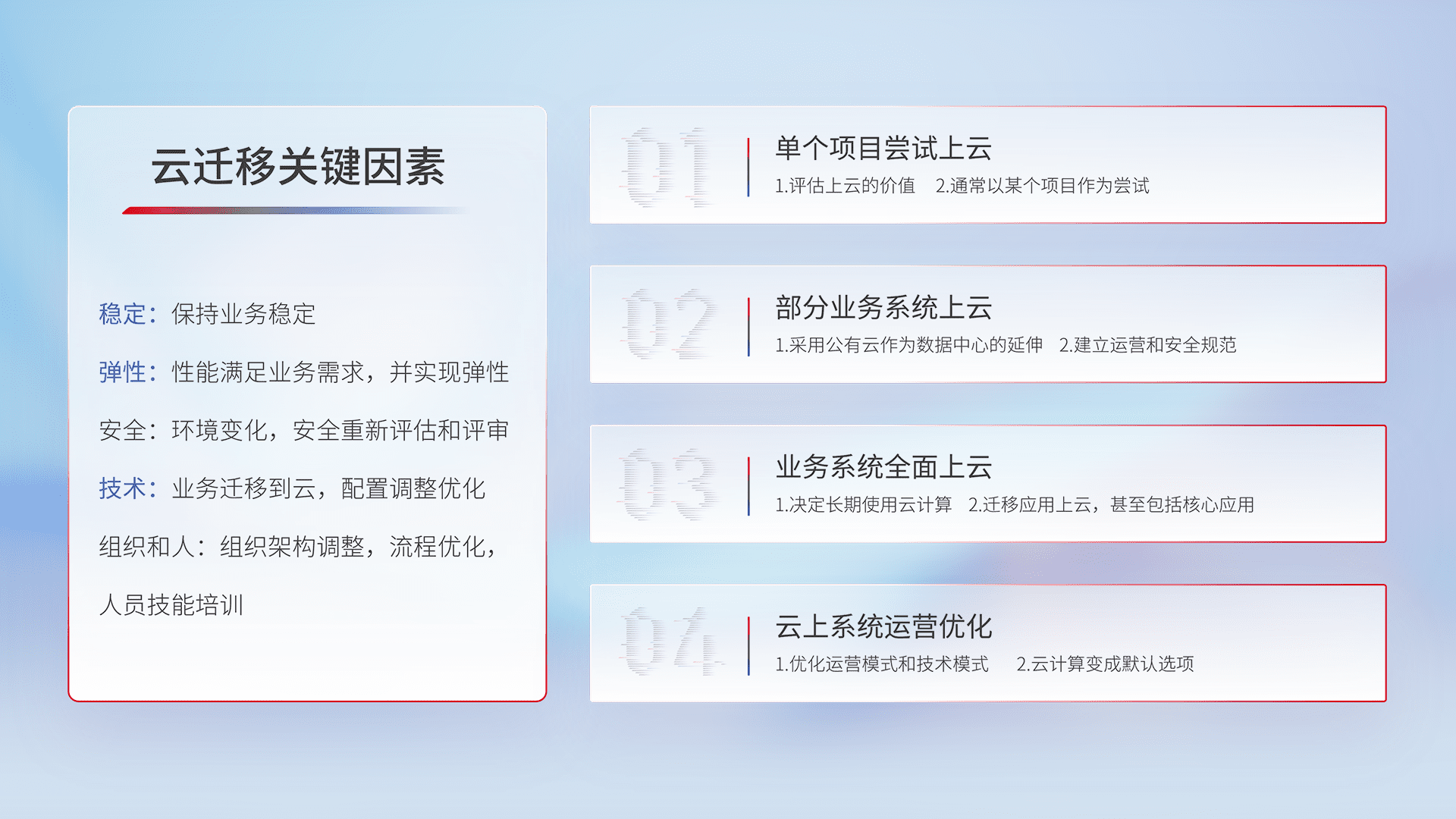 结合实际业务,,从规划设计、、云平台选型、、、、云原生改造、、数据迁移、、、、集成交付,,,迁移全过程为客户识别最佳上云路径,,,,做好风险识别管理,,,,设计网络架构、、、、身份权限、、安全审计合规、、、、操作审计、、日志审计、、、监控告警策略、、、、多站点容灾设计等,,对云上基础设施进行整体规划,,,提升IT治理水平,,以满足弹性、、高可用、、、高性能的需求。。。。