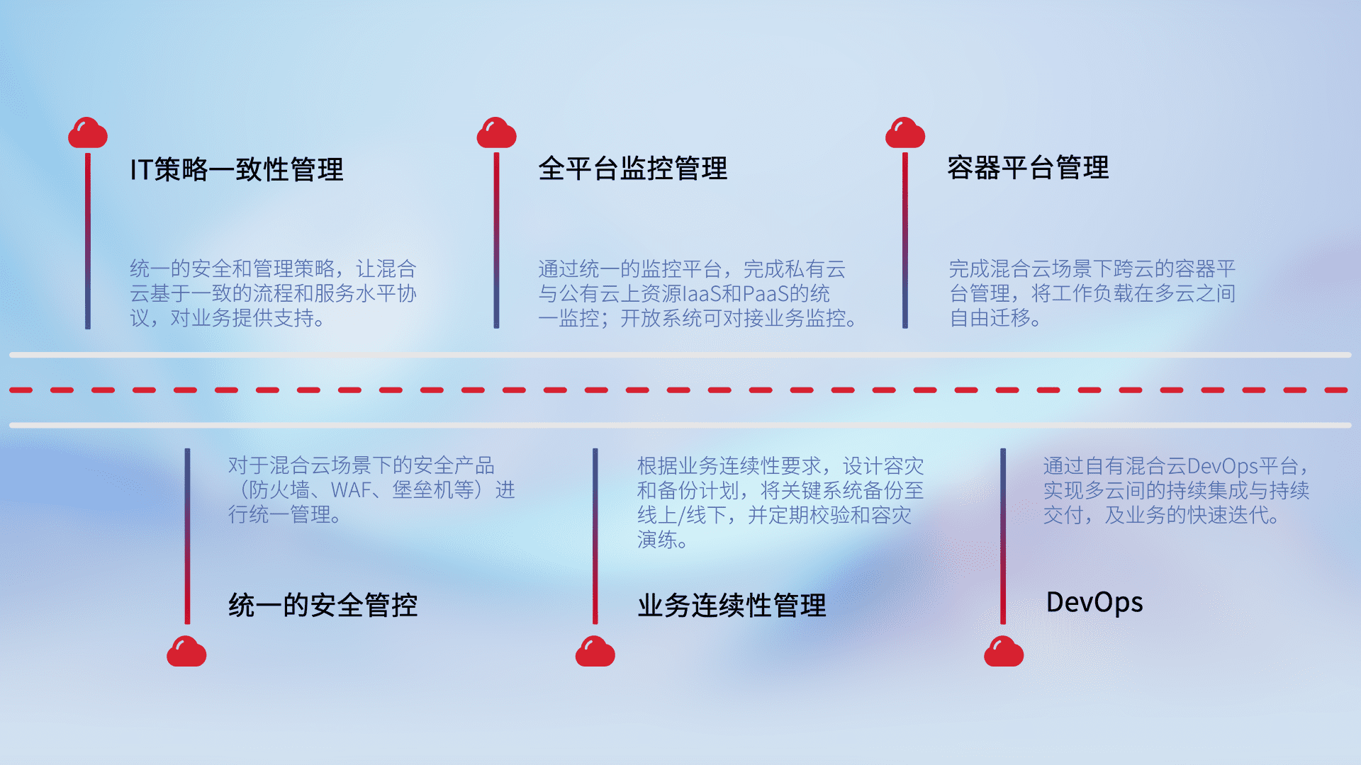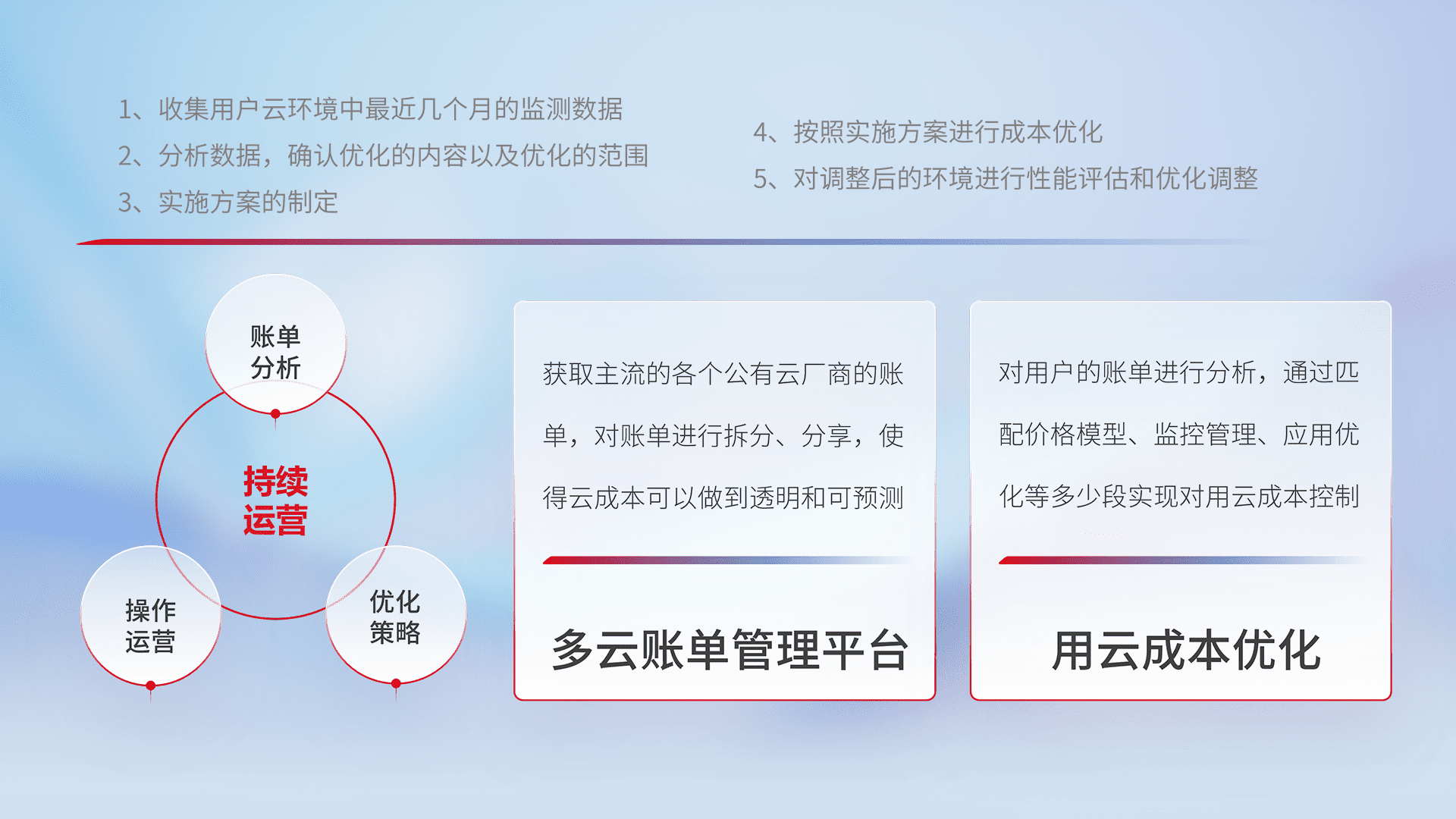 通过多云纳管,,,以统一的资源数据模型把客户的云资源进行抽象和封装,,进而实现对多云资源的统一操作,,,,保障云资源管理的可靠性、、、稳定性与可用性。。量身定制化运维内容,,配置、、开发运维、、、、补丁管理、、、备份、、、监控、、、认证和访问管理、、、、审计和日常巡检等,,,保障在用云过程中的可靠度,,稳定度以及高可用率。。。。